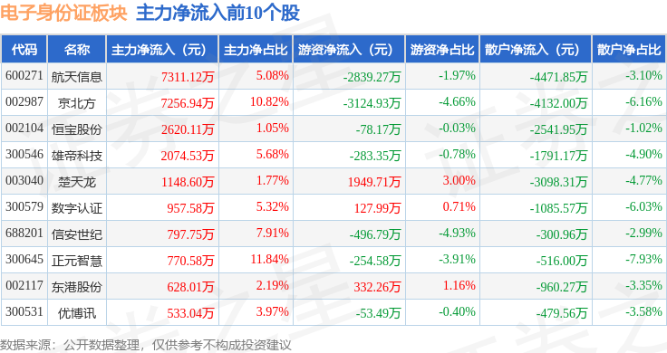 从资金流向上来看,当日电子身份证板块主力资金净流入6187.64万元,游资资金净流出2045.44万元,散户资金净流出4142.2万元。电子身份证板块个股资金流向见下表: