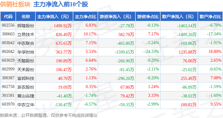 从资金流向上来看,当日供销社板块主力资金净流出1.06亿元,游资资金净流出49.97万元,散户资金净流入1.06亿元。供销社板块个股资金流向见下表: