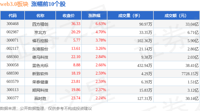 证券之星消息,12月25日web3.0板块较上一交易日上涨2.01%,四方精创领涨。当日上证指数报收于3959.62,上涨0.47%。深证成指报收于13531.41,上涨0.33%。web3.0板块个股涨跌见下表: