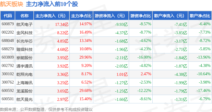 从资金流向上来看,当日航天板块主力资金净流入44.71亿元,游资资金净流出22.99亿元,散户资金净流出21.71亿元。航天板块个股资金流向见下表: