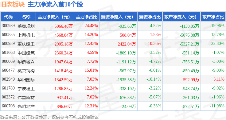 从资金流向上来看,当日旧改板块主力资金净流出5.59亿元,游资资金净流出2.16亿元,散户资金净流入7.75亿元。旧改板块个股资金流向见下表: