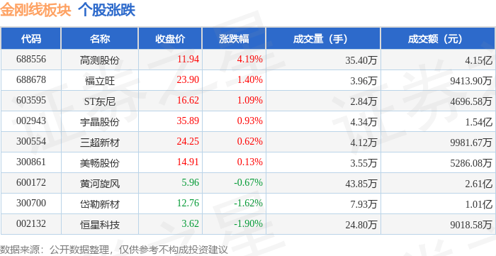 证券之星消息,12月25日金刚线板块较上一交易日上涨0.79%,高测股份领涨。当日上证指数报收于3959.62,上涨0.47%。深证成指报收于13531.41,上涨0.33%。金刚线板块个股涨跌见下表: