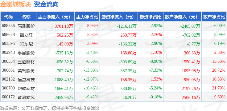 从资金流向上来看,当日金刚线板块主力资金净流出2765.62万元,游资资金净流出2643.8万元,散户资金净流入5409.42万元。金刚线板块个股资金流向见下表: