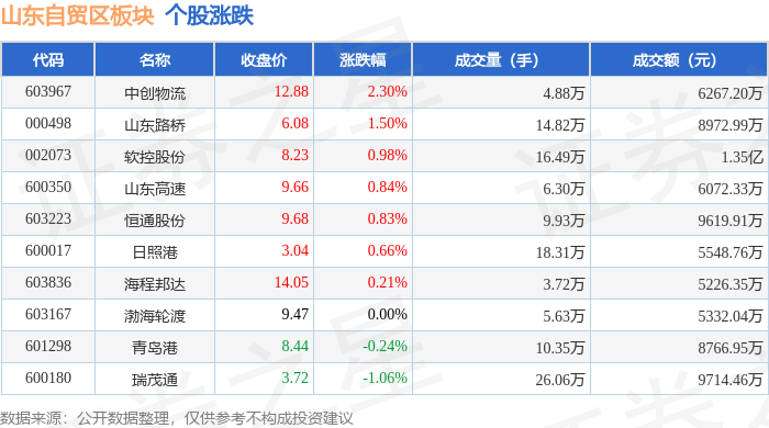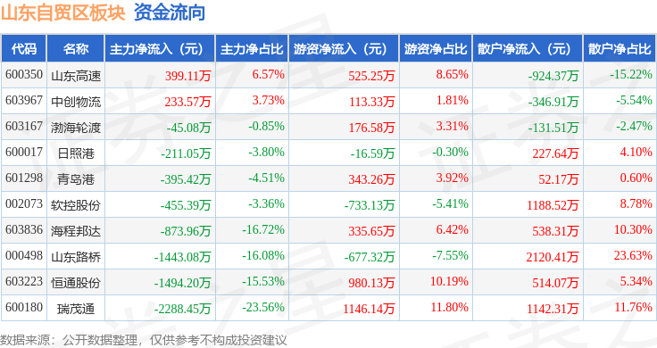 从资金流向上来看,当日山东自贸区板块主力资金净流出6573.95万元,游资资金净流入2193.3万元,散户资金净流入4380.65万元。山东自贸区板块个股资金流向见下表: