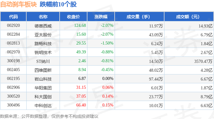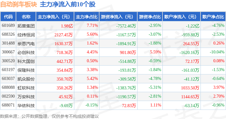 从资金流向上来看,当日自动刹车板块主力资金净流出2.38亿元,游资资金净流出9060.08万元,散户资金净流入3.29亿元。自动刹车板块个股资金流向见下表: