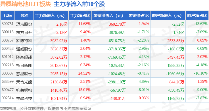 从资金流向上来看,当日异质结电池HJT板块主力资金净流出2.78亿元,游资资金净流入6394.45万元,散户资金净流入2.14亿元。异质结电池HJT板块个股资金流向见下表: