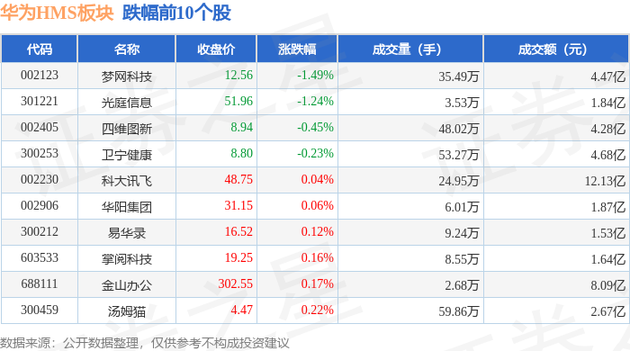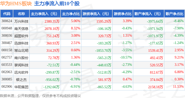 从资金流向上来看,当日华为HMS板块主力资金净流出3.93亿元,游资资金净流入3292.29万元,散户资金净流入3.6亿元。华为HMS板块个股资金流向见下表: