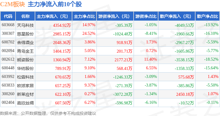 从资金流向上来看,当日C2M板块主力资金净流出1.57亿元,游资资金净流入120.36万元,散户资金净流入1.56亿元。C2M板块个股资金流向见下表: