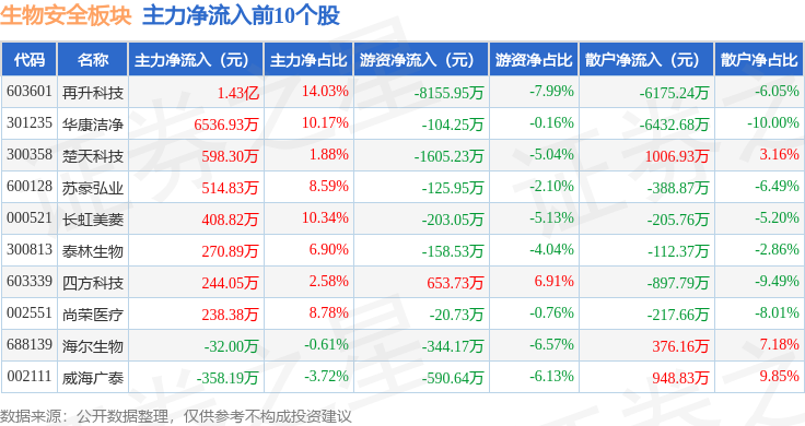 从资金流向上来看,当日生物安全板块主力资金净流出1.48亿元,游资资金净流出2511.82万元,散户资金净流入1.73亿元。生物安全板块个股资金流向见下表: