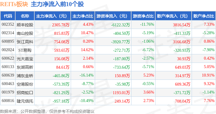 从资金流向上来看,当日REITs板块主力资金净流出2.1亿元,游资资金净流出6990.78万元,散户资金净流入2.8亿元。REITs板块个股资金流向见下表: