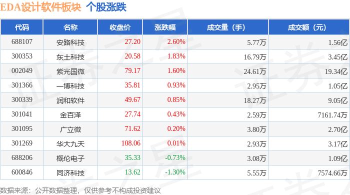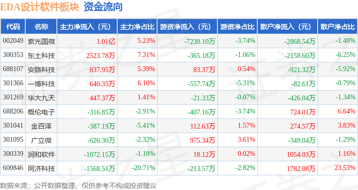 从资金流向上来看,当日EDA设计软件板块主力资金净流入1.06亿元,游资资金净流出7613.63万元,散户资金净流出2971.46万元。EDA设计软件板块个股资金流向见下表: