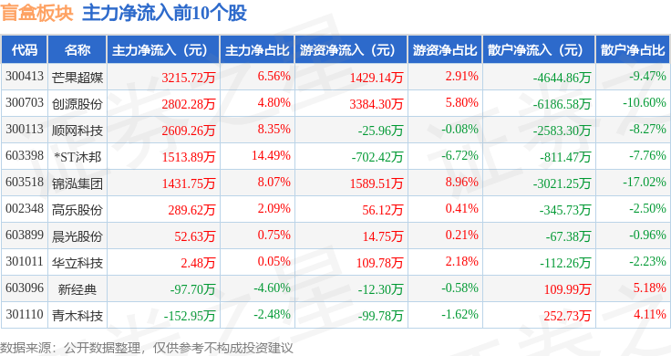 从资金流向上来看,当日盲盒板块主力资金净流出1.24亿元,游资资金净流入8325.49万元,散户资金净流入4033.26万元。盲盒板块个股资金流向见下表: