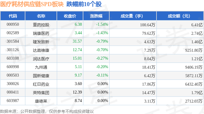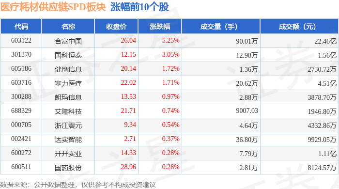 证券之星消息,12月25日医疗耗材供应链SPD板块较上一交易日上涨0.31%,合富中国领涨。当日上证指数报收于3959.62,上涨0.47%。深证成指报收于13531.41,上涨0.33%。医疗耗材供应链SPD板块个股涨跌见下表: