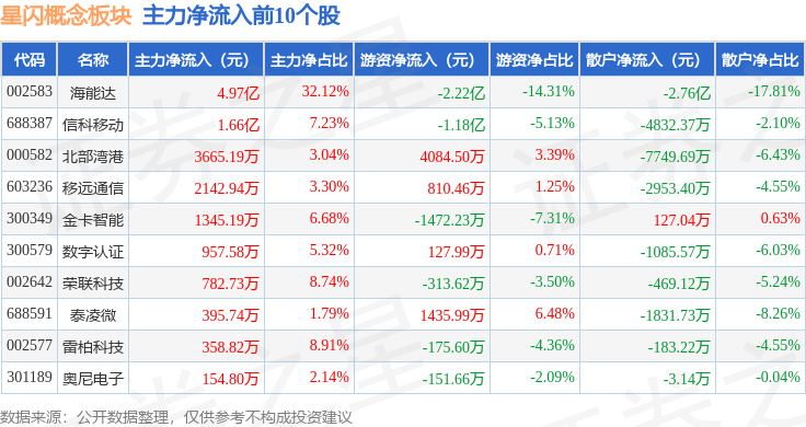 从资金流向上来看,当日星闪概念板块主力资金净流出5.27亿元,游资资金净流入3651.26万元,散户资金净流入4.91亿元。星闪概念板块个股资金流向见下表: