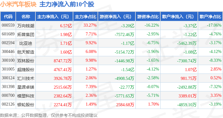 从资金流向上来看,当日小米汽车板块主力资金净流入5.15亿元,游资资金净流出10.19亿元,散户资金净流入5.04亿元。小米汽车板块个股资金流向见下表: