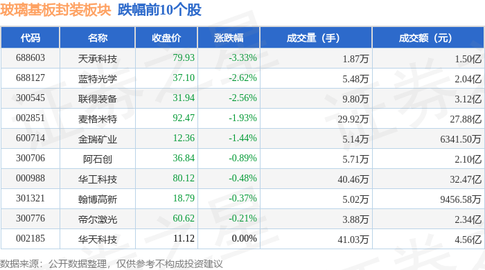 证券之星消息,12月25日玻璃基板封装板块较上一交易日下跌0.28%,天承科技领跌。当日上证指数报收于3959.62,上涨0.47%。深证成指报收于13531.41,上涨0.33%。玻璃基板封装板块个股涨跌见下表: