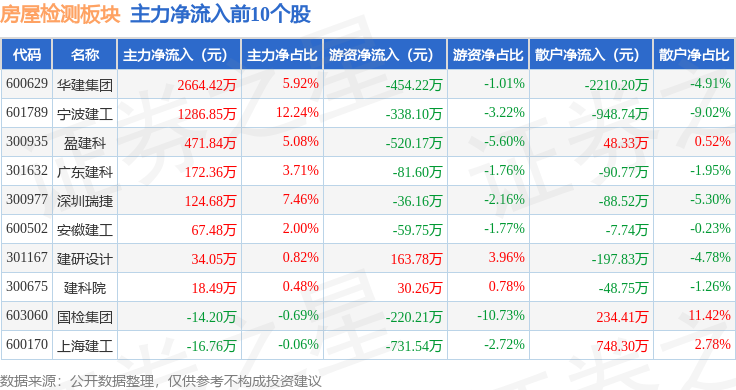 从资金流向上来看,当日房屋检测板块主力资金净流出7208.87万元,游资资金净流出1271.01万元,散户资金净流入8479.88万元。房屋检测板块个股资金流向见下表: