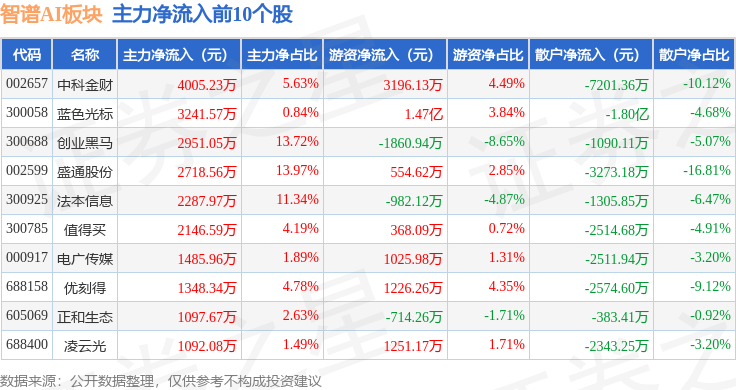 从资金流向上来看,当日智谱AI板块主力资金净流出7.09亿元,游资资金净流入4.16亿元,散户资金净流入2.93亿元。智谱AI板块个股资金流向见下表: