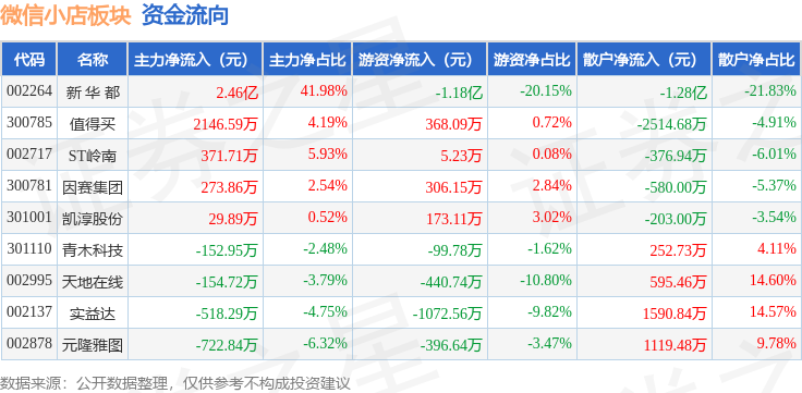 从资金流向上来看,当日微信小店板块主力资金净流入2.59亿元,游资资金净流出1.3亿元,散户资金净流出1.29亿元。微信小店板块个股资金流向见下表: