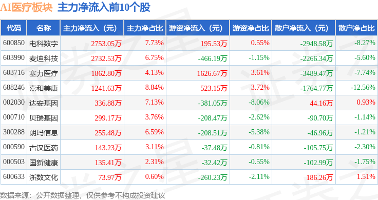 从资金流向上来看,当日AI医疗板块主力资金净流出2.27亿元,游资资金净流入2714.85万元,散户资金净流入2.0亿元。AI医疗板块个股资金流向见下表: