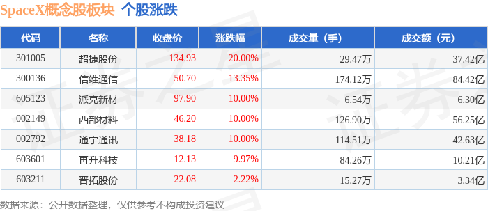 证券之星消息,12月25日SpaceX概念股板块较上一交易日上涨12.02%,超捷股份领涨。当日上证指数报收于3959.62,上涨0.47%。深证成指报收于13531.41,上涨0.33%。SpaceX概念股板块个股涨跌见下表: