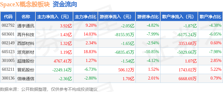 从资金流向上来看,当日SpaceX概念股板块主力资金净流入5.75亿元,游资资金净流出5.0亿元,散户资金净流出7462.44万元。SpaceX概念股板块个股资金流向见下表: