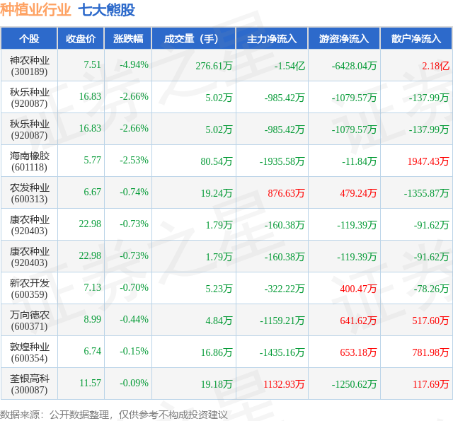 个股表现方面,种植业行业当日领跌股为神农种业(300189),该股当日报收7.51,下跌4.94%,成交量276.61万,主力资金净流出1.54亿元。秋乐种业(920087)以下跌2.66%紧随其后,该股当日成交量5.02万,主力资金净流出985.42万元。除此之外,秋乐种业(920087)、海南橡胶(601118)、农发种业(600313)均进入当日熊股之列。具体个股列表见下表: