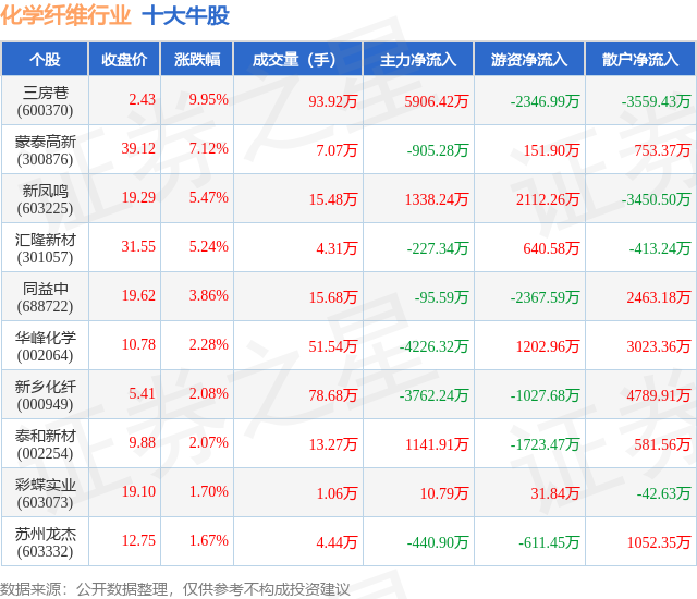 个股表现方面,化学纤维行业当日领涨股为三房巷(600370),该股当日报收2.43,上涨9.95%,成交量93.92万,主力资金净流入5906.42万元。蒙泰高新(300876)以上涨7.12%紧随其后,该股当日成交量7.07万,主力资金净流出905.28万元。除此之外,新凤鸣(603225)、汇隆新材(301057)、同益中(688722)均进入当日牛股之列。具体个股列表见下表:
