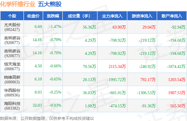 个股表现方面,化学纤维行业当日领跌股为尤夫股份(002427),该股当日报收6.69,下跌1.47%,成交量56.36万,主力资金净流入63.9万元。吉林碳谷(920077)以下跌0.7%紧随其后,该股当日成交量4.29万,主力资金净流出708.92万元。除此之外,吉林碳谷(920077)、恒天海龙(000677)、皖维高新(600063)均进入当日熊股之列。具体个股列表见下表: