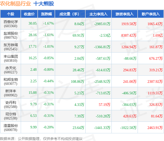 个股表现方面,农化制品行业当日领跌股为百傲化学(603360),该股当日报收30.05,下跌1.67%,成交量8.04万,主力资金净流出2985.01万元。盐湖股份(000792)以下跌1.61%紧随其后,该股当日成交量69.91万,主力资金净流出2.53亿元。除此之外,东方铁塔(002545)、丰山集团(603810)、赤天化(600227)均进入当日熊股之列。具体个股列表见下表: