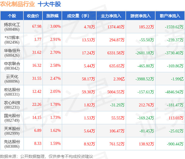 个股表现方面,农化制品行业当日领涨股为扬农化工(600486),该股当日报收67.98,上涨3.0%,成交量4.7万,主力资金净流入1374.4万元。*ST辉丰(002496)以上涨2.91%紧随其后,该股当日成交量13.53万,主力资金净流入294.87万元。除此之外,华鲁恒升(600426)、中农联合(003042)、云天化(600096)均进入当日牛股之列。具体个股列表见下表:
