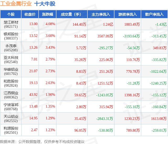 个股表现方面,工业金属行业当日领涨股为楚江新材(002171),该股当日报收13.0,上涨4.08%,成交量144.4万,主力资金净流入1.24亿元。银邦股份(300337)以上涨3.6%紧随其后,该股当日成交量91.14万,主力资金净流入3507.09万元。除此之外,永茂泰(605208)、亚太科技(002540)、华峰铝业(601702)均进入当日牛股之列。具体个股列表见下表: