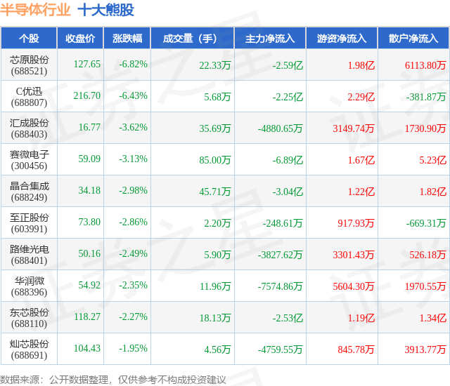 个股表现方面,半导体行业当日领跌股为芯原股份(688521),该股当日报收127.65,下跌6.82%,成交量22.33万,主力资金净流出2.59亿元。C优迅(688807)以下跌6.43%紧随其后,该股当日成交量5.68万,主力资金净流出2.25亿元。除此之外,汇成股份(688403)、赛微电子(300456)、晶合集成(688249)均进入当日熊股之列。具体个股列表见下表: