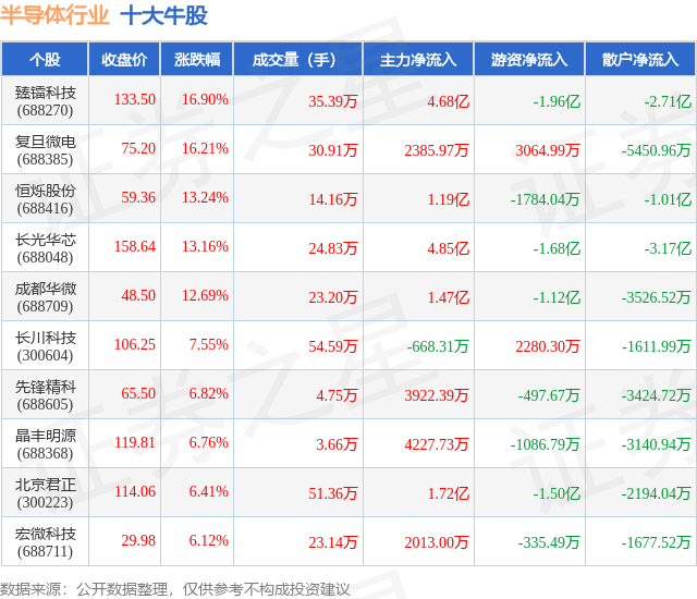 个股表现方面,半导体行业当日领涨股为臻镭科技(688270),该股当日报收133.5,上涨16.9%,成交量35.39万,主力资金净流入4.68亿元。复旦微电(688385)以上涨16.21%紧随其后,该股当日成交量30.91万,主力资金净流入2385.97万元。除此之外,恒烁股份(688416)、长光华芯(688048)、成都华微(688709)均进入当日牛股之列。具体个股列表见下表: