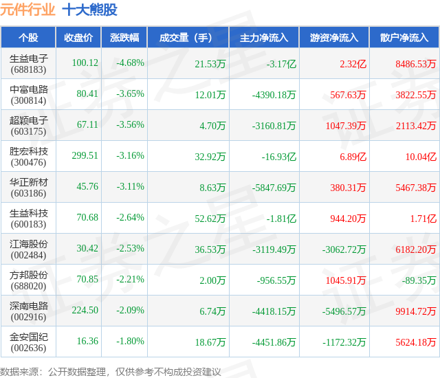 个股表现方面,元件行业当日领跌股为生益电子(688183),该股当日报收100.12,下跌4.68%,成交量21.53万,主力资金净流出3.17亿元。中富电路(300814)以下跌3.65%紧随其后,该股当日成交量12.01万,主力资金净流出4390.18万元。除此之外,超颖电子(603175)、胜宏科技(300476)、华正新材(603186)均进入当日熊股之列。具体个股列表见下表: