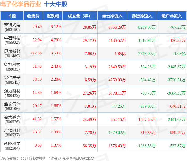 个股表现方面,电子化学品行业当日领涨股为莱特光电(688150),该股当日报收29.49,上涨6.12%,成交量28.85万,主力资金净流入8756.29万元。中石科技(300684)以上涨4.79%紧随其后,该股当日成交量29.17万,主力资金净流入1186.57万元。除此之外,思泉新材(301489)、德邦科技(688035)、兴福电子(688545)均进入当日牛股之列。具体个股列表见下表: