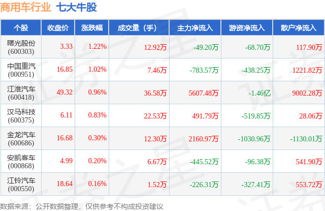 个股表现方面,商用车行业当日领涨股为曙光股份(600303),该股当日报收3.33,上涨1.22%,成交量12.92万,主力资金净流出49.2万元。中国重汽(000951)以上涨1.02%紧随其后,该股当日成交量7.46万,主力资金净流出783.57万元。除此之外,江淮汽车(600418)、汉马科技(600375)、金龙汽车(600686)均进入当日牛股之列。具体个股列表见下表: