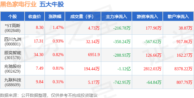 个股表现方面,黑色家电行业当日领涨股为*ST高斯(002848),该股当日报收8.3,上涨1.47%,成交量4.73万,主力资金净流出216.78万元。四川九洲(000801)以上涨0.93%紧随其后,该股当日成交量32.14万,主力资金净流出350.24万元。除此之外,辰奕智能(301578)、兆驰股份(002429)、九联科技(688609)均进入当日牛股之列。具体个股列表见下表: