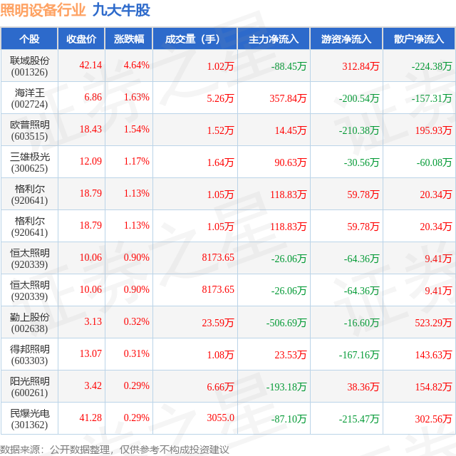 个股表现方面,照明设备行业当日领涨股为联域股份(001326),该股当日报收42.14,上涨4.64%,成交量1.02万,主力资金净流出88.45万元。海洋王(002724)以上涨1.63%紧随其后,该股当日成交量5.26万,主力资金净流入357.84万元。除此之外,欧普照明(603515)、三雄极光(300625)、格利尔(920641)均进入当日牛股之列。具体个股列表见下表: