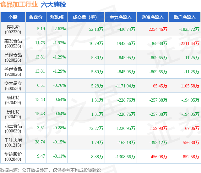 个股表现方面,食品加工行业当日领跌股为得利斯(002330),该股当日报收5.19,下跌2.63%,成交量52.18万,主力资金净流出430.74万元。惠发食品(603536)以下跌1.92%紧随其后,该股当日成交量10.79万,主力资金净流出1942.56万元。除此之外,盖世食品(920826)、盖世食品(920826)、交大昂立(600530)均进入当日熊股之列。具体个股列表见下表: