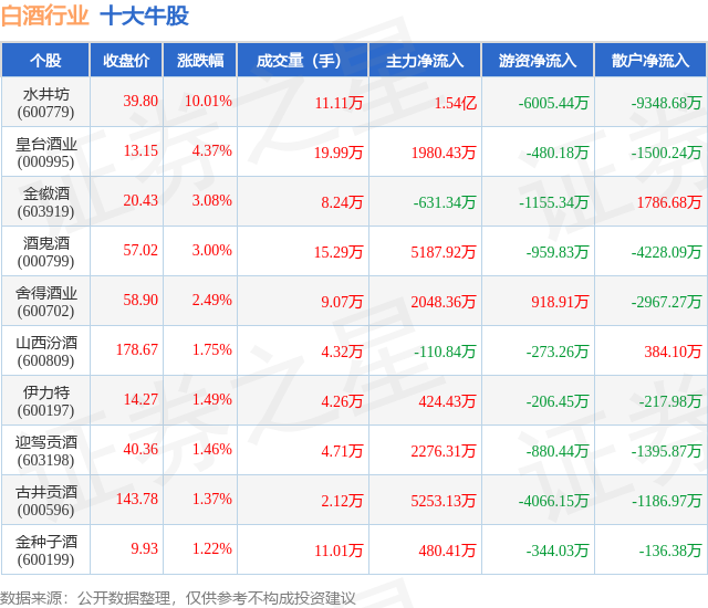 个股表现方面,白酒行业当日领涨股为水井坊(600779),该股当日报收39.8,上涨10.01%,成交量11.11万,主力资金净流入1.54亿元。皇台酒业(000995)以上涨4.37%紧随其后,该股当日成交量19.99万,主力资金净流入1980.43万元。除此之外,金徽酒(603919)、酒鬼酒(000799)、舍得酒业(600702)均进入当日牛股之列。具体个股列表见下表: