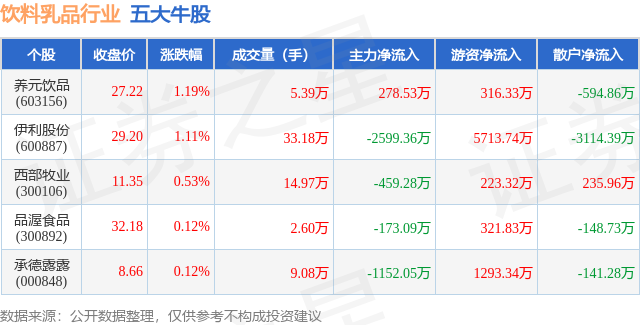 个股表现方面,饮料乳品行业当日领涨股为养元饮品(603156),该股当日报收27.22,上涨1.19%,成交量5.39万,主力资金净流入278.53万元。伊利股份(600887)以上涨1.11%紧随其后,该股当日成交量33.18万,主力资金净流出2599.36万元。除此之外,西部牧业(300106)、品渥食品(300892)、承德露露(000848)均进入当日牛股之列。具体个股列表见下表: