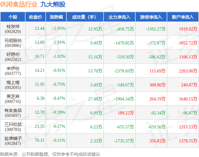 个股表现方面,休闲食品行业当日领跌股为桂发祥(002820),该股当日报收12.44,下跌2.05%,成交量12.95万,主力资金净流出416.75万元。元祖股份(603886)以下跌1.91%紧随其后,该股当日成交量9.49万,主力资金净流出1479.85万元。除此之外,好想你(002582)、来伊份(603777)、煌上煌(002695)均进入当日熊股之列。具体个股列表见下表:
