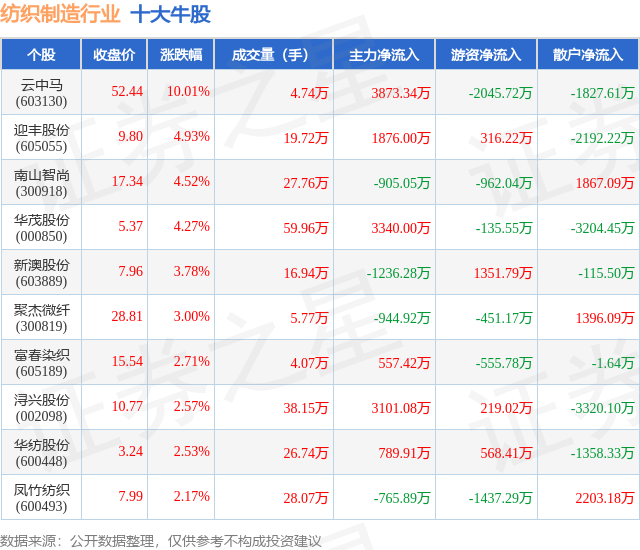 个股表现方面,纺织制造行业当日领涨股为云中马(603130),该股当日报收52.44,上涨10.01%,成交量4.74万,主力资金净流入3873.34万元。迎丰股份(605055)以上涨4.93%紧随其后,该股当日成交量19.72万,主力资金净流入1876.0万元。除此之外,南山智尚(300918)、华茂股份(000850)、新澳股份(603889)均进入当日牛股之列。具体个股列表见下表: