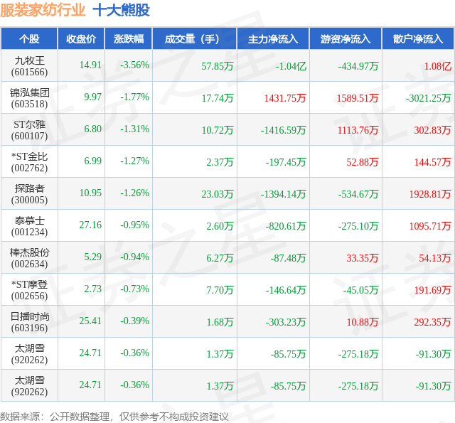 个股表现方面,服装家纺行业当日领跌股为九牧王(601566),该股当日报收14.91,下跌3.56%,成交量57.85万,主力资金净流出1.04亿元。锦泓集团(603518)以下跌1.77%紧随其后,该股当日成交量17.74万,主力资金净流入1431.75万元。除此之外,ST尔雅(600107)、*ST金比(002762)、探路者(300005)均进入当日熊股之列。具体个股列表见下表: