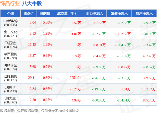 个股表现方面,饰品行业当日领涨股为ST新华锦(600735),该股当日报收5.04,上涨5.0%,成交量7.57万,主力资金净流入901.33万元。金一文化(002721)以上涨1.95%紧随其后,该股当日成交量61.01万,主力资金净流出122.26万元。除此之外,飞亚达(000026)、菜百股份(605599)、明牌珠宝(002574)均进入当日牛股之列。具体个股列表见下表: