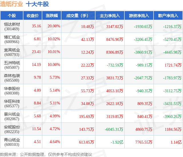 个股表现方面,造纸行业当日领涨股为恒达新材(301469),该股当日报收35.16,上涨20.0%,成交量10.48万,主力资金净流入3147.02万元。博汇纸业(600966)以上涨10.02%紧随其后,该股当日成交量42.13万,主力资金净流入8476.9万元。除此之外,宜宾纸业(600793)、五洲特纸(605007)、森林包装(605500)均进入当日牛股之列。具体个股列表见下表: