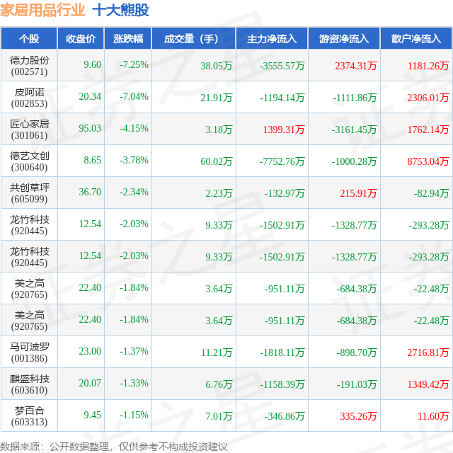 个股表现方面,家居用品行业当日领跌股为德力股份(002571),该股当日报收9.6,下跌7.25%,成交量38.05万,主力资金净流出3555.57万元。皮阿诺(002853)以下跌7.04%紧随其后,该股当日成交量21.91万,主力资金净流出1194.14万元。除此之外,匠心家居(301061)、德艺文创(300640)、共创草坪(605099)均进入当日熊股之列。具体个股列表见下表: