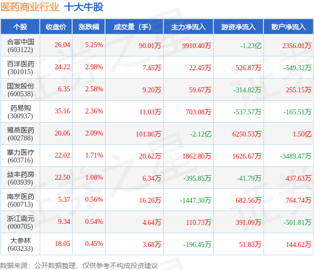 个股表现方面,医药商业行业当日领涨股为合富中国(603122),该股当日报收26.04,上涨5.25%,成交量90.01万,主力资金净流入9910.4万元。百洋医药(301015)以上涨2.98%紧随其后,该股当日成交量7.45万,主力资金净流入22.45万元。除此之外,国发股份(600538)、药易购(300937)、鹭燕医药(002788)均进入当日牛股之列。具体个股列表见下表: