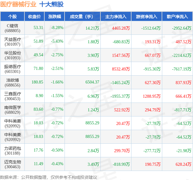 个股表现方面,医疗器械行业当日领跌股为C健信(688805),该股当日报收53.31,下跌8.28%,成交量14.21万,主力资金净流入4465.28万元。天益医疗(301097)以下跌5.43%紧随其后,该股当日成交量1.88万,主力资金净流出680.83万元。除此之外,华兰股份(301093)、振德医疗(603301)、浩欧博(688656)均进入当日熊股之列。具体个股列表见下表: